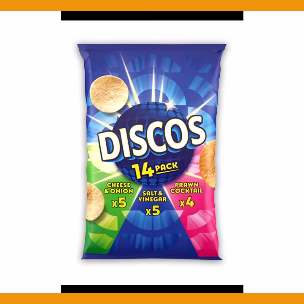 Classic Discos shape, classic crisp flavours. With the nation’s favourite cheese & onion, Salt & Vinegar, and Prawn Cocktail flavours in a giant multipack perfectly portioned for lunchboxes.